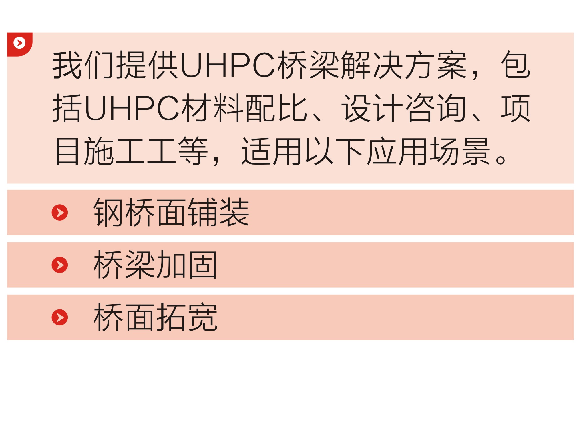 Ductal®超可隆应用于桥梁工程已有二十多年经验,我们分析每座桥梁的独特需求,可根据复杂的工程场景提供针对性的钢桥面铺装、桥梁加固、桥面拓宽解决方案。我们提供材料配比、设计咨询、施工管理全套解决方案。