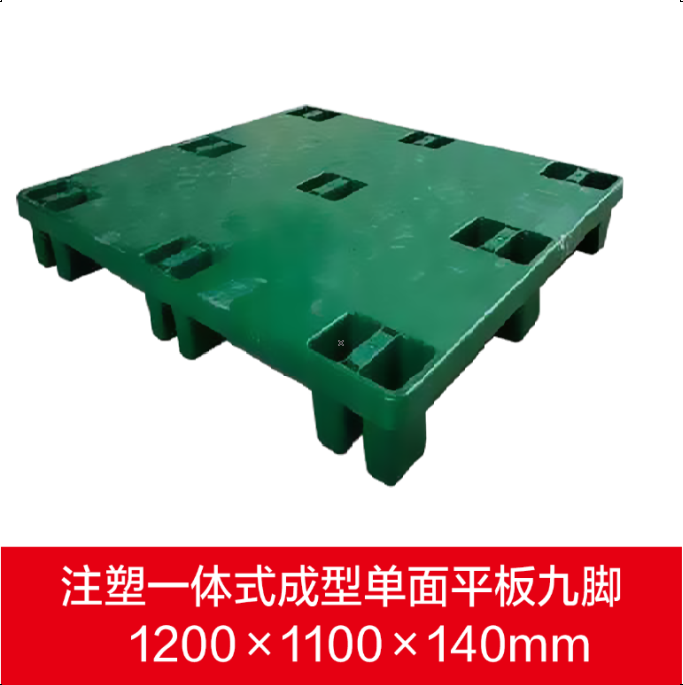 单面平板九脚塑料托盘 静载载重1.5吨,能叠放;具备承重能力强、抗冲击性、耐腐蚀性、低摩擦系数等优质性能,可循环使用36个月及以上